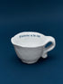Handmade ceramic cappuccino mug with a glossy glaze. The Issues collection brings irony and seduction to everyday dining. Decorated with blue lettering.